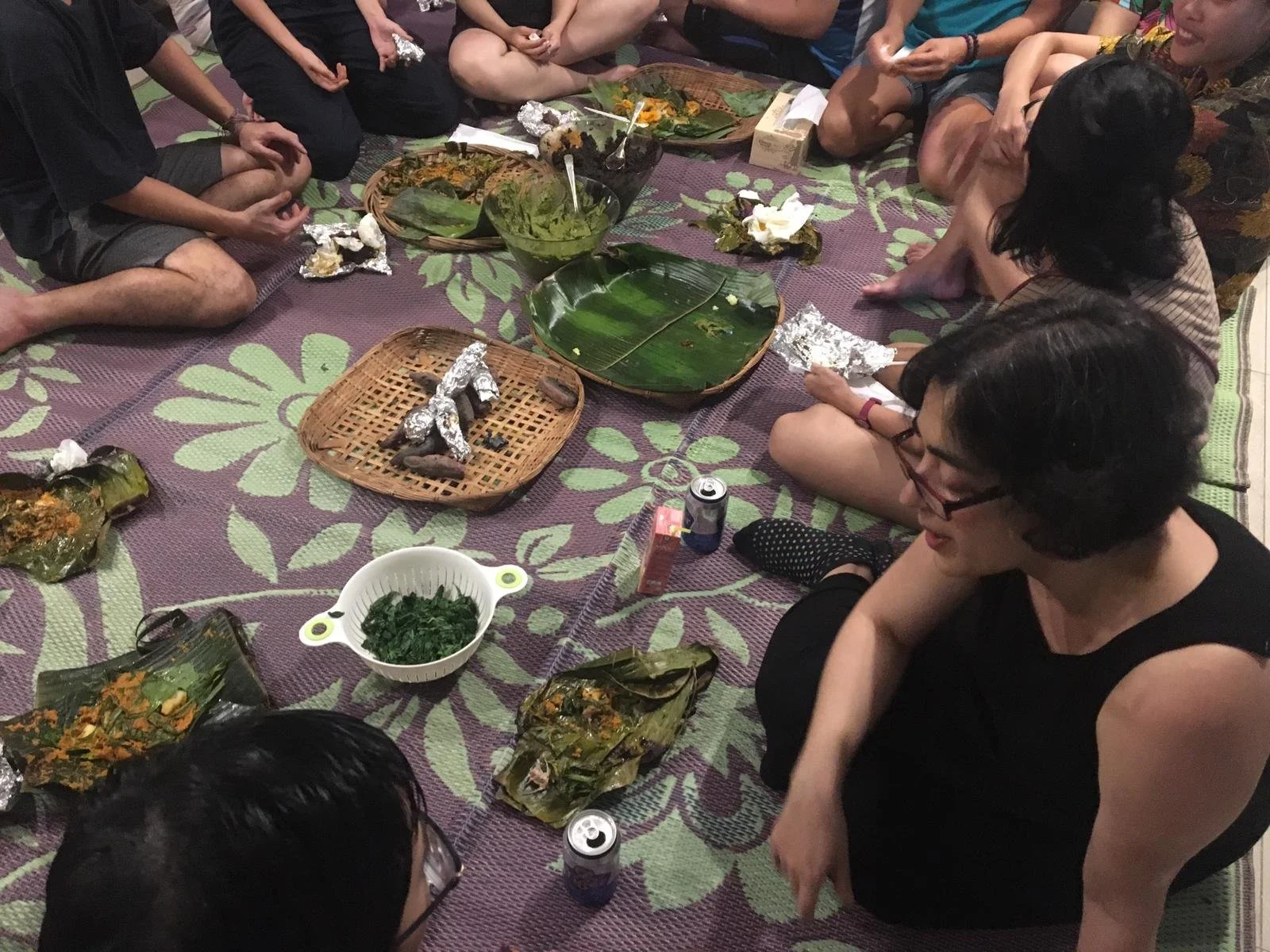Arts practitioners gathering and eating around a table filled with food prepared by Practice Tuckshop and Chef Priscill Koh during the opening dinner (Photo: Joseph Nair)